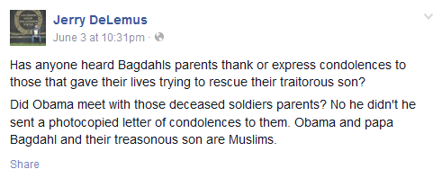 In a Facebook message, DeLemus notes the Constitution defines treason as giving aid and comfort to the enemy. “Now by releasing the 5 top enemies in our ‘war on terror’ how is this not treason?” he asked. “Obama and papa Bagdahl [sic] and their treasonous son are Muslims,” DeLemus added, as if to explain the President’s actions.