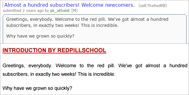 When “The Red Pill Sidebar” was published in 2015, a post that had been written by pk_atheist in November 2012 to introduce the forum was included – but it was now attributed to RedPillSchool. RedPillSchool thanked the member who assembled the collection and he placed a copy on a Red Pill website “so it doesn’t disappear one day.”