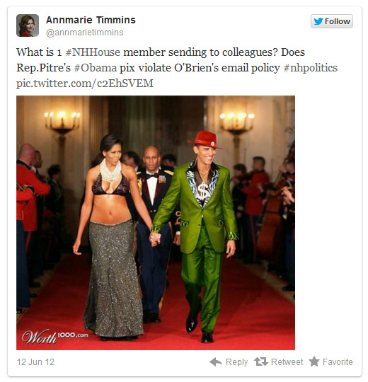 In that incident, which followed a crackdown by then-Speaker Bill O’Brien over “harassing, derogatory, and defamatory” messages, Concord Monitor reporter Annmarie Timmins reported that Pitre sent an email to fellow lawmakers that included a photoshopped image of a purported White House event that featured Pres. Obama and the First Lady dressed as a “pimp and a ho.”