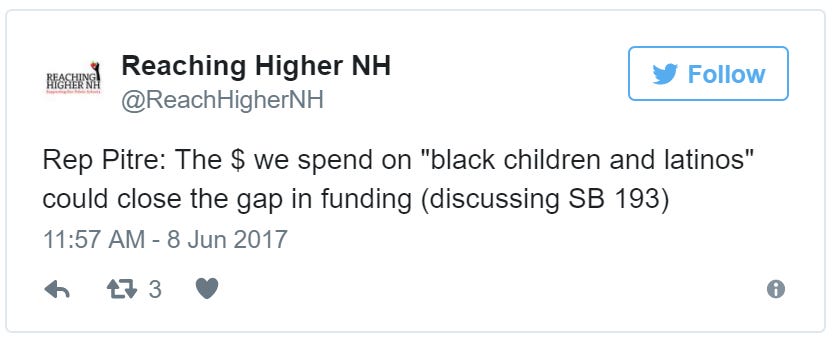 During today’s House committee debate on school voucher legislation, a representative from a public education advocacy group, Reaching Higher NH, reported Rep. Joe Pitre (R-Farmington) claimed the proposal could be funded with money the state currently spends on “black children and latinos.”