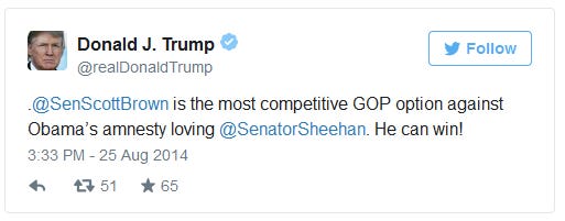 Trump opponents are reminding conservatives that the billionaire business mogul endorsed former U.S. Sen. Scott Brown, who had the backing of the party establishment, in his 2014 primary contest for the right to take on Sen. Jeanne Shaheen. “[W]eird, I’m not finding where the anti establishment candidate ever backed anyone anti-establishment,” noted one conservative.