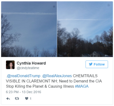 Cynthia Howard, Sullivan County co-chair of the Trump for President campaign, snapped photos and then alerted Infowars’ Alex Jones and the incoming President that she had spotted “chemtrails” in Claremont. “Need to Demand the CIA Stop Killing the Planet & Causing Illness,” the Tea Party activist tweeted.