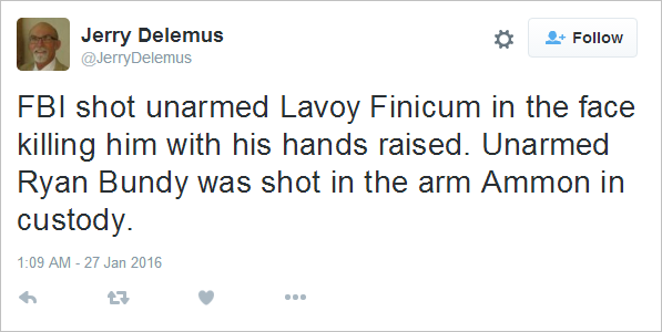 Supporters claimed Finicum was gunned down as he attempted to surrender. The “FBI shot unarmed LaVoy Finicum in the face killing him with his hands raised,” DeLemus tweeted just hours after the deadly confrontation. His source was 18-year-old Victoria Sharp, who was in the vehicle during the deadly encounter. Finicum was “just walking with his hands in the air and they shot him, and they shot him dead, and then after he was down on the ground they shot him three more times,” she insisted.