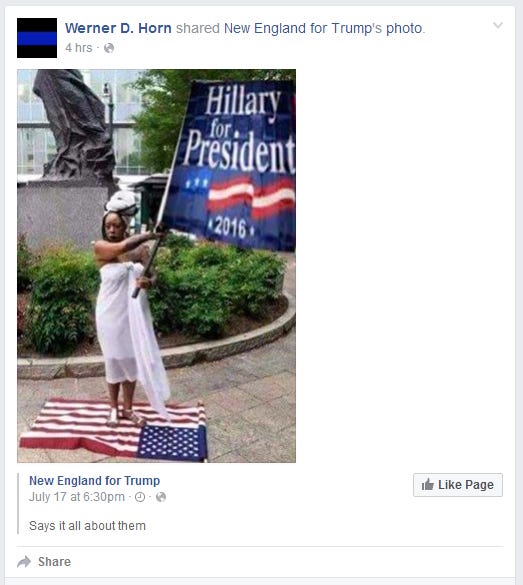 This afternoon, the co-chair of the New Hampshire Veterans for Trump Coalition promoted an image of a Hillary Clinton supporter with racial undertones: a black woman in African dress, standing on an American flag, waving a Hillary for President banner.
