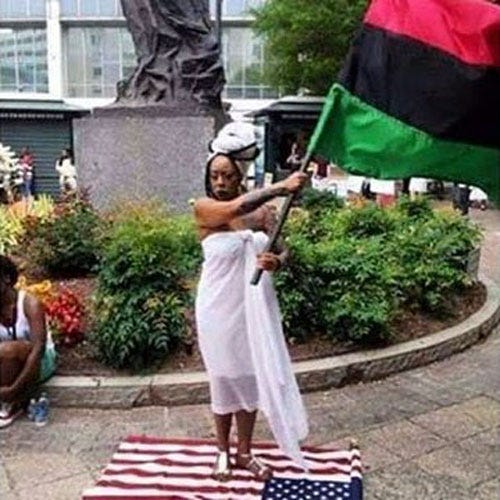 It was a fake. The original photo, on which the image was based, pictures Latausha Nedd, a Georgia activist, waving a Pan-African Flag rather than a Hillary for President banner (see below).