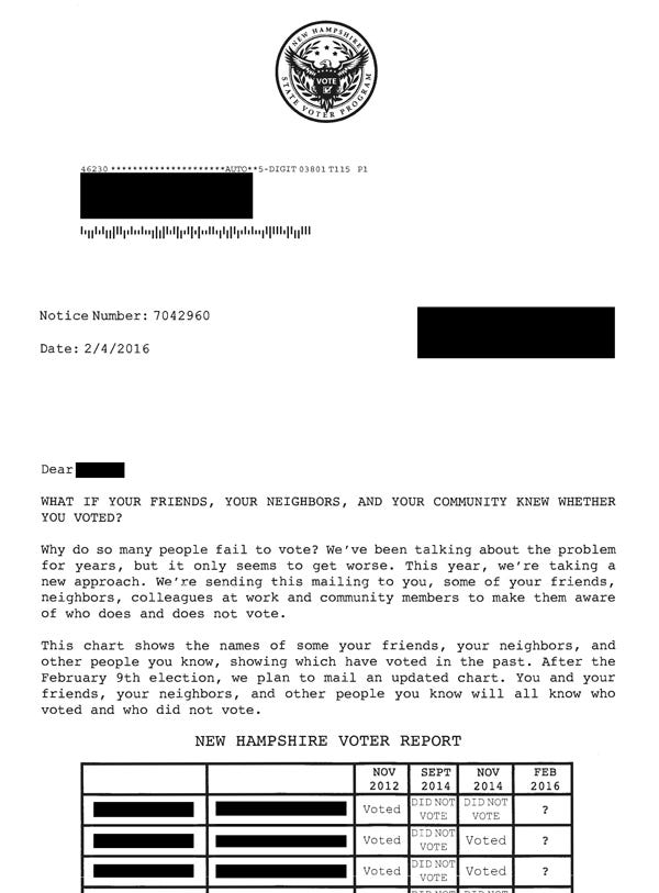 The New Hampshire mailing reproduces the language used by the researchers that increased turnout by 8 to 9 percentage points, similar to what can be achieved through door-to-door canvassing.