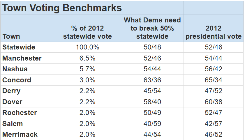 Daily Kos Elections has developed “county benchmarks” to help understand partial returns. I’ve reproduced the New Hampshire data here. The chart lists the eight New Hampshire towns that provided at least 2% of the statewide vote in 2012 with the percentage the Democratic candidate in each race needs to be on track to hit 50 percent statewide.