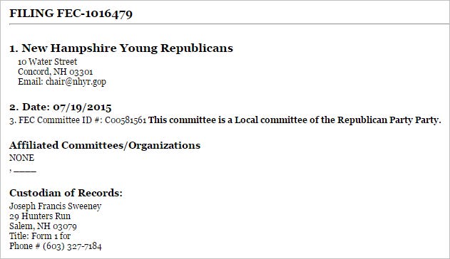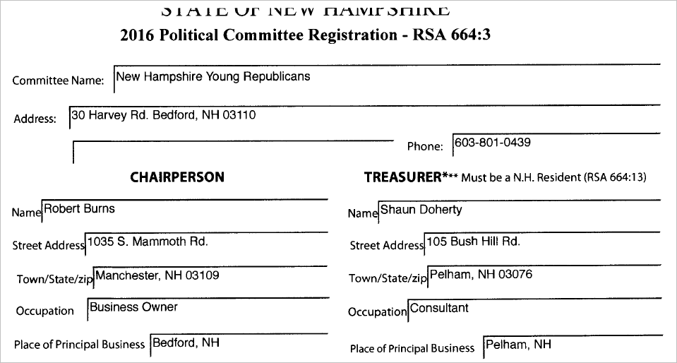 Saturday, the group led by Bob Burns announced it has registered “New Hampshire Young Republicans” as a state political committee with Burns as chair and Shaun Doherty as treasurer. “Any other rogue groups that pop up are not valid and should stop using the ‘Paid for by NHYR’ tag on their website.” they declared.